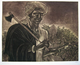 Each of the different value areas on a plate is etched at different length of time. The deeper the etch, the more ink will gather in the etched texture and the more solidly the area will print. To learn to look at the topography of an etching; the metal's subtle clues of process and of the artist's decision-making choices, offers another level to enjoy.